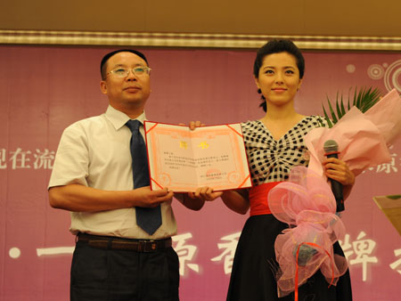 曾黎接受蓝剑酿酒公司的代言证书