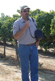Jim Wolpert shows off the field trial vineyards at Parlier, Calif. |