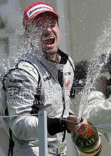 8月23日,布朗车队车手巴里切罗在颁奖仪式上泼洒香槟庆祝胜利。当日,在西班牙巴伦西亚进行的F1欧洲大奖赛的比赛中,巴