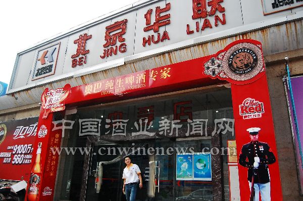 在位于文化路和黄河路口的北京华联中孚店,从店外到店内,具有西方风情文化的奥巴啤酒广告吸引着消费者的眼球,而产品堆头陈列更为壮观,占据了以往一线品牌的位置及宣传优势。
