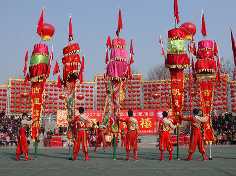Zhongfan features a 10-odd-meter main bamboo pole, with a strip of 0.5m-wide and 5.5m-long flag hanging down from the tip. On the obverse side are embroidered benedictory sentences and auspicious patterns while on the reverse one the name of the performing team, hence also the name - “the signal flag”. It is made of two bamboo poles joint together with a net weight over 30 Jin, being thick at the lower part and thin at the upper one.