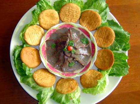 “Dragon-phoenix bride cake” is a famous dessert popular in Jianli County, Hubei Province which features slight sweetness, fragrance and crispness. It is as big as a plate and is 0.5kg or 0.4kg in weight, with a character “Xi” (means happiness) in the center which is surrounded by patterns of flying dragon and dancing phoenix, hence the name. Because of its special symbol, local people always treat relatives with it at wedding ceremony, symbolizing share of happy event.