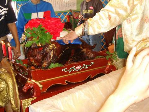 Famous Traditional Mongolia Dish. It is a decent dish for VIPs or big ceremonies. In this dish, a whole lamb is kneeling down on the plate, with its crisp skin and freshly cooked meat.