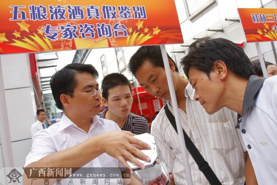 专业人员向消费者介绍真假酒辨别知识。广西新闻网记者 梁凯昌 摄
