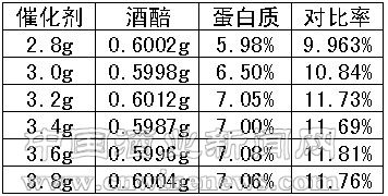 本着使药品最大程度地发挥其效率而又节约药品的原则,由表中结果得出,当酒醅用量在0.6g左右时,催化剂的最佳用量为3.2g,浓硫酸的最佳用量为8mL。