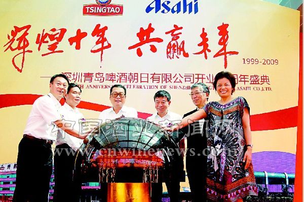 日前, 深圳青岛朝日啤酒有限公司举行十周年庆典仪式。从1999年青岛啤酒在华南1万多千升销量发展到2008年的104万千升,创造了十年增长百倍的超常规发展“奇迹”,以特区深圳为发端,在整个广东市场演绎了一场啤酒版的“春天的故事”。