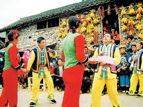 Moreover, the tray dance and dage (literally, beat songs, a folk entertainment featuring song and dance) prevalent in some ethnic groups of China also feature the contents of serving and drinking tea, which can be deemed as a kind of tea dance from a certain angle. For example, when the Yi minority performs their folk dance after the guests are seated, all people, young and old in the village or family hosting the folk dance, will send a tea tray or wine tray to their guests in a respectfully dancing manner to the music of gong and Suona and then withdraw.
