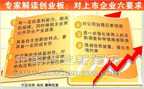 深圳证券交易所总监刘江红近日在2009中国风险投资论坛——振兴东北投资高峰会上介绍,我国刚刚推出的创业板市场,通过IPO管理办法、上市业务管理办法、发改委管理办法、创业板股票上市规则和投资者适当的管理规定等一系列配套制度,总结起来对在创业板上申请上市的企业提出了六方面要求。