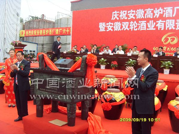 9月19日,安徽高炉酒厂60周年庆典暨安徽双轮酒业有限责任公司揭牌仪式在安徽双轮酒业有限公司隆重举行,中国食品工业协会白酒专业委员会常务副会长兼秘书长马勇,亳州市、涡阳县相关领导以及来自全国各地的经销商出席了此次会议。