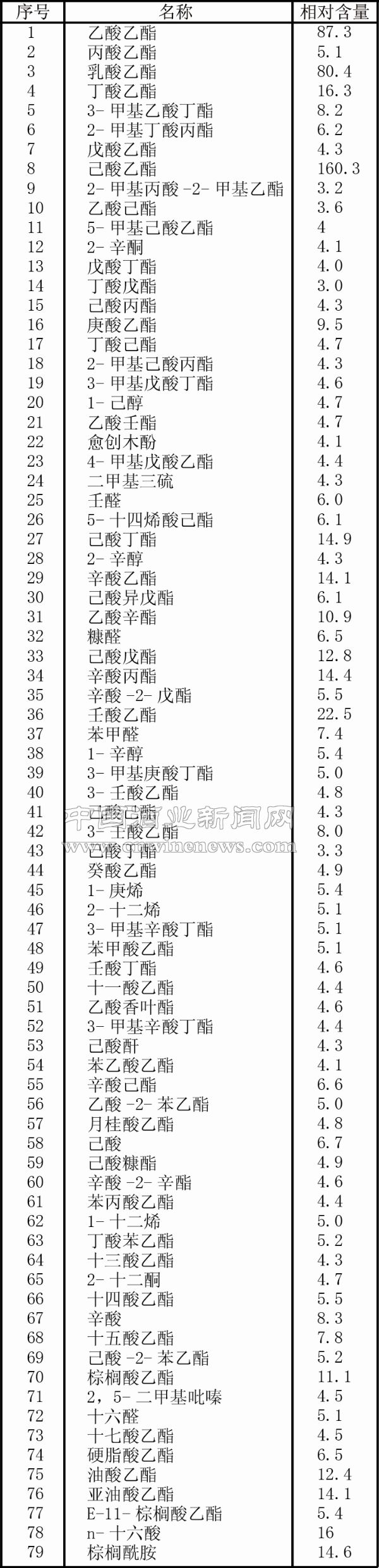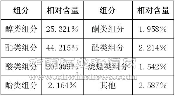 从表3中的数据可以看出,在古贝春浓香型白酒中,酯类物质占有绝对含量,像浓香型白酒香味的主体香成分己酸乙酯具有浓郁的水果香味;乳酸乙酯、乙酸乙酯、丁酸乙酯、丙酸乙酯、戊酸乙酯等酯类,具有各种各样的水果香气,对浓香型白酒的香气组成具有突出的贡献;山东古贝春浓香型白酒中的有机酸也是主要的香气和口味组成成分。其中,乙酸具有特殊的醋香,乳酸具有微弱的酸乳气味,丁酸具有酸败奶油的香气,己酸具有椰子油脂香气;其中含有的高分子的有机脂肪酸像油酸、亚油酸等对人身体健康具有保健作用;酚类物质具有浓郁的香气,像愈创木酚、苯酚等物质具有花类香气;许多醛类和酮类物质在浓香型白酒的香气组成中也具有重要的作用;此外,浓香型古贝春酒中还有许多吡嗪类化合物。