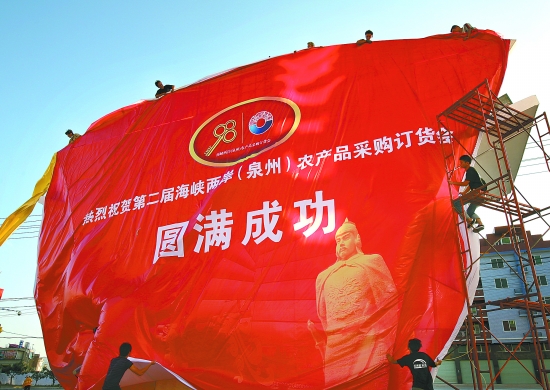 作为“9·8”投洽会重要活动之一,第二届海峡两岸(泉州)农产品采购订货会将于本月7日至9日在位于南安市石井镇的闽台农产品交易市场举办。泉州检验检疫局有关人士介绍,昨日下午,最后一批台湾展品抵达南安,至此,共有5批台湾参展商品通关,包括水果、饼干、高粱酒、葡萄酒、乌龙茶等农产品及小食品等相关产品450多种, 涉及台湾参展商300多个。这是工作人员在搭设巨幅宣传墙喜迎盛会。