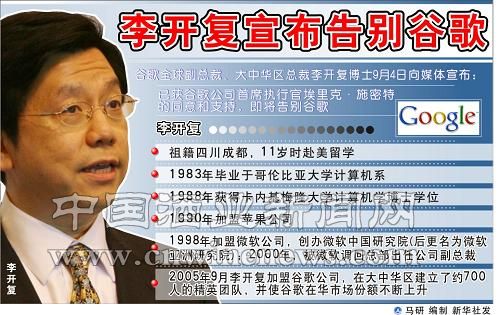 新华社信息上海9月4日电(记者高少华)Google(谷歌)中国公司4日宣布,谷歌全球副总裁兼大中华区总裁李开复博士将于9月中旬离开谷歌,杨文洛将接替其负责谷歌在中国工程与研发方面的职责,现负责谷歌大中华区销售业务的全球副总裁刘允将接替其谷歌大中华区商务及运营方面的职责。