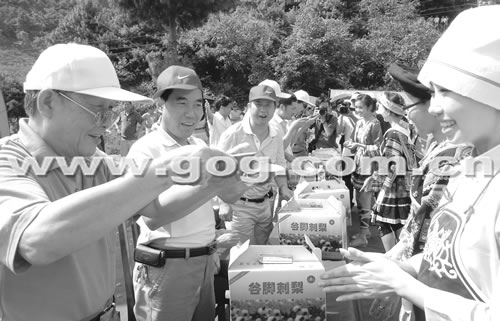 9月6日,2009多彩贵州龙里生态游“十里刺梨沟”品果季在龙里谷脚镇茶香村拉开帷幕,来自贵阳、龙里等地的数百名游客自助到“十里刺梨沟”品尝、采摘、购买刺梨鲜果。图为品果季开幕仪式上,来宾喜饮刺梨酒。