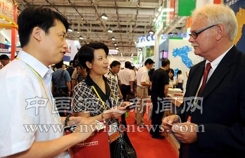 9月8日,国内的参会代表与瑞典政府投资促进署的官员(右)交谈。