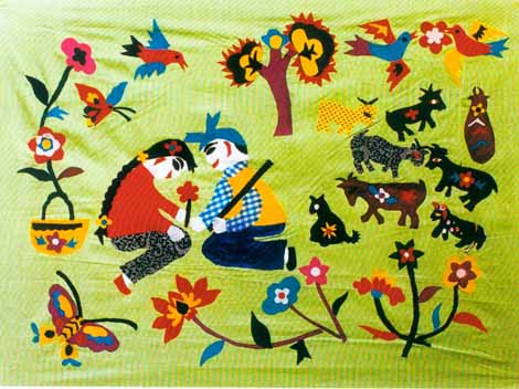 Influenced by paper cutting, another folk fork, the patchwork shares some similarity with paper cutting in terms of the basic forms, but more abstract, exaggerated and lively. The color tones of patchwork are based on folk embroidery, but with sharper contrast than the latter. As the patchwork involves layers and layer of patches, the thickness produces a special relief, 3-D feel.