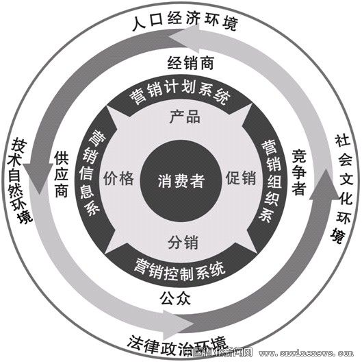 系统营销平台容纳了宏观营销环境(人口经济环境、社会文化环境、法律政治环境和技术自然环境)、微观营销环境(供应商、经销商、竞争者和社会公众)、营销管理系统(营销计划系统、营销组织系统、营销控制系统、营销信息系统)、企业4P组合(产品、价格、渠道、促销),其中消费者是核心。