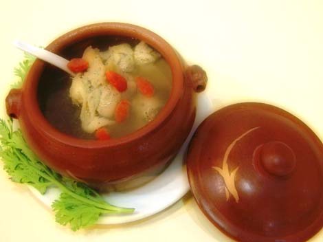 Guoqiaorice noodles are a dish that has long been famous in Yunnan. It came from a story in southern Yunnan. A scholar, preparing for the imperial examinations, isolated himself on an island in a lake to concentrate on his study. His devoted wife was dismayed that the meals she took to him always arrived cold after crossing a long, wooden bridge. But by chance, she discovered the way to keep soup boiling hot -- to top it with a thin layer of vegetable oil. Of course, her husband passed the exams. Soon it got quite popular and was nameGuoqiaorice noodles. The dish is made of soup, sliced meat, rice noodle and seasonings. A big china bowl will be served with boiling soup and a cover of oil. The soup is made of boiled chicken and pork bone and the clearer, the better. Chicken, pork, liver, kidney, fish and pickled pork are cut into slices. Seasonings are made of boiled vegetables. The raw sliced meat should be the first to put into the soup. After a few minutes, noodles and seasonings follow. The smell and the taste never fail the gourmands. No visit to Yunnan is complete without trying this unique and delicious dish.