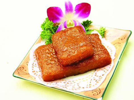 Nian Gao: In Chinese, Nian Gao sounds like "getting higher year by year". In Chinese people's mind, the higher you are, the more prosperous your business is. Main ingredients of Nian Gao are sticky rice, sugar, Chestnuts, Chinese date and lotus leaves.