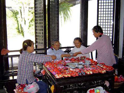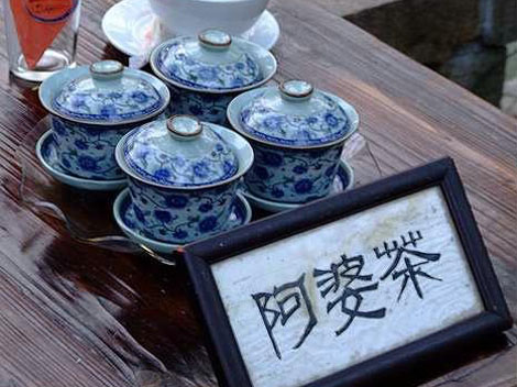 Grandma's Tea (Apo Tea) is a kind of folk custom handed down from the ancient time in the water country of Shangta Town in the west of the Dianshan Lake of Shanghai's suburb Qingpu. The farmers especially the old women in rural area like visiting each other and sitting around tables in the halls or sheds of the farmers, with salted amaranth, dried turnip, jiusu bean and other local and special products. They chew the rag while drinking the tea, they talk about strange stories and family affairs. Though they are busy in talking, they do not stop doing the needlework. This ethical vogue of receiving others with tea, which can promote the exchange of thoughts and affection and the harmonious friendship, has become a custom in Shangta town as the time passes.
