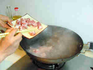 Take another boiler and pour in 5 bowls of water and boil the water; put in the spareribs together with tied-up Pu’er tea bag, onion slices, ginger, garlic and 3 spoons of oyster juice in the boiling water in the pan for 20 minutes with strong heat and then reduce to a simmer for 10 minutes.