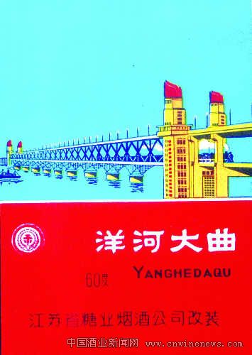 这是一枚早期的洋河大曲酒标。酒标的主图是武汉长江大桥,大桥如虹,卧立在波涛滚滚的万里长江之上。酒标上半部为蓝色,下半部为红色,大桥桥头堡为黄色,色彩对比强烈,极具视觉冲击力。长江大桥在火花、烟标中,时有反映,而在酒标中以大桥为图案的,极为罕见,这枚大桥酒标是难得的珍品。