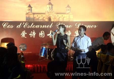 晚宴上,来宾们在音乐和歌声的陪伴下,品尝了主办方精心准备的美食和法国爱诗图古堡酒庄出品的爱诗图波尔多白葡萄酒2007、爱诗图红葡萄酒2007、爱诗图马泽特园2001、爱诗图宝塔庄园(二标)2004、爱诗图古堡(头等苑2级)1993。