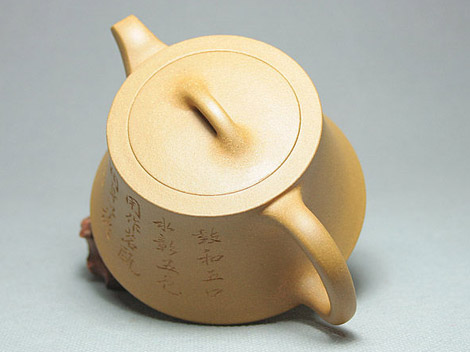 This seemingly simple process is actually quite demanding, especially for the simplest and least decorated pots. For while small imperfections can be hidden underneath decorations or carving, even the smallest flaws or imbalances in the shape of an undecorated pot are obvious even to an untrained eye. While round, unadorned teapots, differing in shape and curve, are a classic favorite, Yixing teapots are also decorated in all sorts of beautiful designs. At one extreme are pots shaped to look like fruits and vegetables, or pieces of wood or bamboo, with amazingly lifelike textures and artful imperfections. Others are decorated with Chinese calligraphy or poems. One of the most traditional and beautiful styles combines the simplicity of plain teapots with touches drawn from nature - such as crafting the handle to look like a plum branch, with a small spray of flowers spreading over a section of the pot.