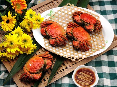 Chinese mitten crab, also known as the big sluice crab (大闸蟹) and Shanghai hairy crab (上海毛蟹), is a medium-sized burrowing crab that is native in the coastal estuaries of eastern Asia from Korea in the north to the Fujian province of China in the south, but has been introduced to Europe and North America where considered an invasive species. The crab is a famous delicacy in Shanghai cuisine and is prized for the female crab roe. The crab meat is believed by the Chinese to have a "cooling" (Yin,阴) effect on the body.