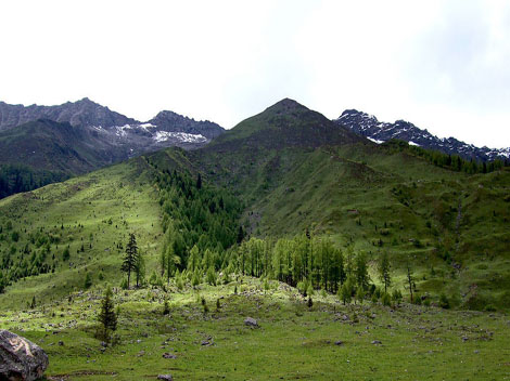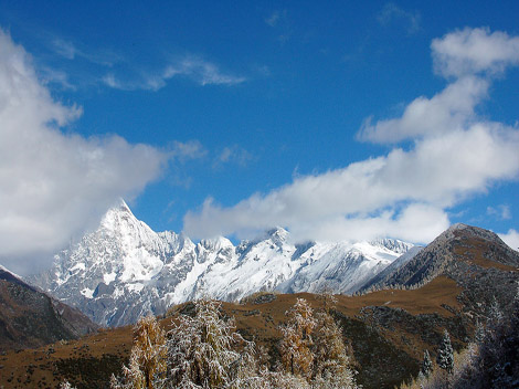 Four Girl Mountain is famed for its steep and imposing ridges. The high meadows are gorgeous throughout the four seasons. Hundreds of wildflowers burst forth in spring, giving way to luxuriant green trees and grass in summer. In the fall, the leaves on the trees blaze in color heralding the coming snows of winter. Because of the clear, blue sky, the thick forest at the foot of the mountains, the verdant grassland, and the murmuring streams, Four Girl Mountain is sometimes known as the 'Alps of the Orient'. You may, in fact, think you are in southern Europe.