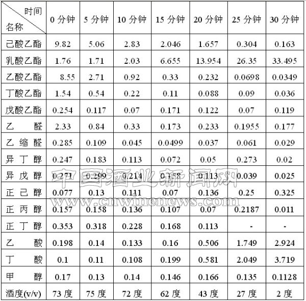 上甑要求轻、松、薄、匀、散、探汽上甑、上平上匀。装甑结束后,甑桶内的料醅要求边高中低,按上甑操作要求及缓火蒸馏,大汽追尾,可有效把酒醅中的酒精份及香味物质最大限度地提取出来,且各阶级馏分中各种香味物质馏出量随蒸馏时间的不同而呈现规律性变化(见表1)。