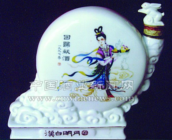 在我的酒器藏品中,有一瓶名曰“汉白明月酒”。瓶为瓷质,净含量750毫升,通体高18.5厘米,基座高3厘米,宽17厘米,在基座和圆月之间,仿佛是很厚的云彩,给人如月球悬挂在空中之动感,玉兔在旁腾云驾雾,仿佛在配合嫦娥做些什么,显得十分忙活。圆形的瓶身,直径14.5厘米,仿佛是中秋之夜的一轮当空的明月,圆似玉盘。月中有装饰纹,只见嫦娥彩袖飘逸,右手托盘,盘中摆放着寿桃和一壶美酒,左手指向盘中之物,仿佛要将它献给人间团圆的人们。在月上竖写着两排字:回归献酒 一九九七年。这是为纪念香港回归祖国后的第一个中秋节特制的,在当年具有特殊意义,寓意香港回到祖国怀抱,在这皎洁明亮之夜,在这美好的时刻,大家共同分享嫦娥献的仙桃和美酒。