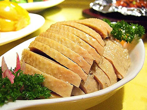 3. Cut the goose into 4 portions and place in a soup bowl. Use the original loquid and add boiling water at the ratio of 1 to 2 make a soup. Add the MSG and pour into the soup bowl with the goose in it to submerge the goose. Let it cool off.