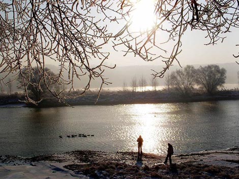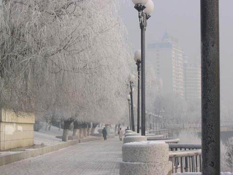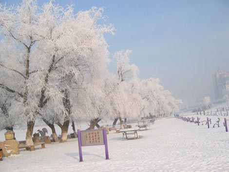 15km away from Jilin City along the Songhuajiang River is Fengman Hydropower Plant and temperature of its water becomes warm through the hydroelectric generating set, about 4 degree even in deep winter. The river water, carrying a great mass of heat energy, forms a grand ice-free view of many kilometers along the Songhuajiang River. The whole river surface is full of vapor and it lingers on for a long time. Walking the upstream of the river, all you could see is the erected pines and drooping willows. Under certain air pressure, temperature and wind direction, the moist over the river forms the rime when meeting with coldness.