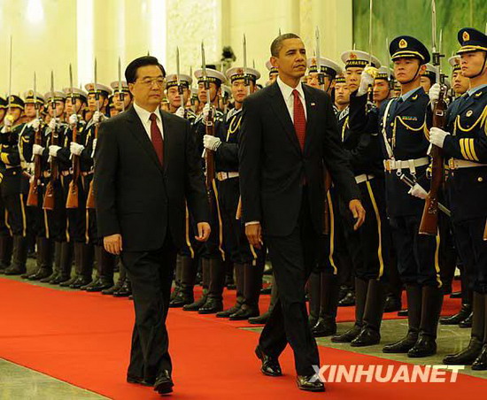 11月17日上午,国家主席胡锦涛在北京人民大会堂北大厅为美国总统奥巴马访华举行欢迎仪式。新华社记者 李涛 摄