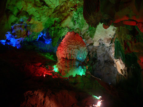 Crown Cave (Guanyan Cave) is not far from Caoping Town and is about 29 km (18 miles) south of Guilin. Due to the crown-shaped hill, the cave beneath was given the name Crown Cave. Because of the sweet and clear spring water running out from the cave, it is also called Ganyan (sweet) Cave. And it is named Guangyan (light) Cave because there is a gleam of light from the ceiling of the pitch-dark cave.