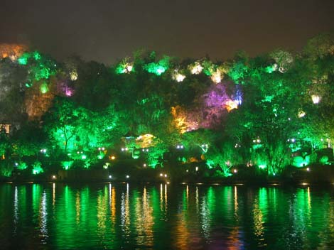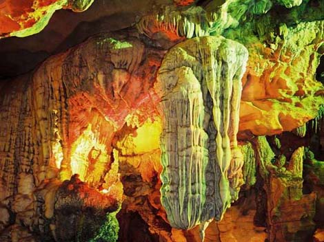 The overall length of Crown Cave is 12 km (7.5 miles). The 3 km (nearly 1.9 miles) near Li River has been developed and opened to the public. It is unique in ways of sight-seeing. First you can reach the mountainside by light rail and descend into the cave by elevator. There are altogether five caves. The stalactites, stalagmites and stone pillars inside will capture your imagination and make you want to linger. Then you can take the light rail to Palm Hall. The tallest palm-like stone pillar among the four in the hall is taller than 50 meters, reaching the ceiling of the cave. The 'palm tree' is so thick that it takes several people to put their arms around it. It is really a wonder! You can't help but marvel at the magical power of nature. Then you can take a small boat to experience the distinctive views of the underground river. Many other karst landscapes are waiting for you after you go ashore from the boat. Crown Cave was listed in the Guinness World Records as a cave with the most ways of traveling.