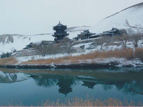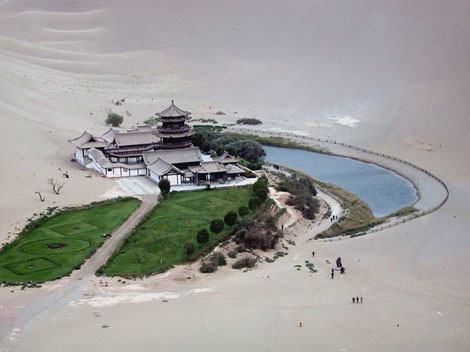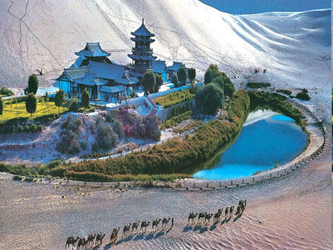 The Mingsha Mountain and the Crescent Moon Spring integrate with the artistic landscape of the Mogao Grottoes, forming the “Two Bests” in the southern Dunhuang City and becoming the tourist resort attractive not only to Chinese but to people from the world.