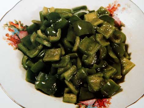 2. Heat the oil in a wok over a high fire until the oil surface ripples. Add the peppers and stir-fry until they shrink slightly. Add the salt, sugar, and a little water. Stir-fry for 2 more minutes, and serve.