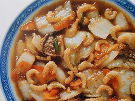 2. Heat 3 tbsp of the oil in a wok until the surface ripples. Add the cabbage and stir-fry for 1 minute. Remove and set aside. Heat 7 tbsp of the oil. Add the scallions and ginger and stir-fry until fragrant. Add the cabbage, shrimps, mushroom and carrot. Pour in the stock and bring to a boil. Add the salt, soy sauce, and ground peppercorn. When the stock has been almost reduced, add the MSG and the cornstarch-water mixture. Cook, stirring, until thickened slightly. Add the sesame oil, remove, and serve.