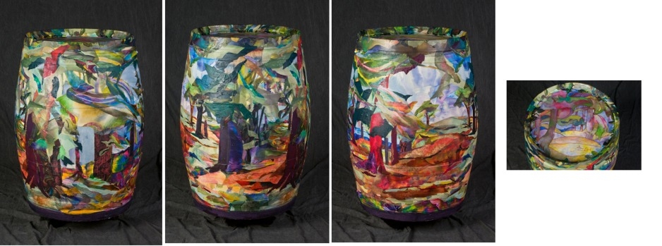 “I’d never worked on a barrel before,” said paper collage artist and former professional musician Anna Nichols. “It was a little challenging at first – I didn’t know what I was going to do. Then the light bulb went on – I saw a rooster with hens and chicks! “