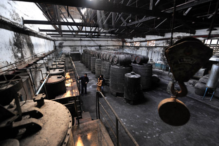 Photo taken on Nov. 20 2009 shows the production line of whisky in the early years in Qingdao Red Wine Cellar in Qingdao, east China's Shandong Province. (Xinhua/Li Ziheng)