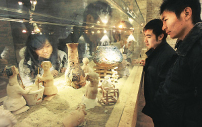 参观啤酒博物馆的游客对原始的生产啤酒的工艺流程产生浓厚兴趣