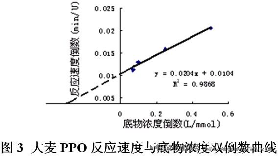 底物浓度对反应速率的影响、反应速度与底物浓度双倒数关系分别见图2、图3。