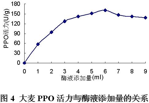 大麦PPO活力与酶液添加量的关系见图4。可以看出,当反应体系中PPO酶液添加量小于6mL时,底物浓度过大,反应速率由酶添加量决定;而当PPO酶添加量大于6mL时,反应速率由底物决定,但由于反应产物对酶活力有抑制作用,因此导致酶活力略有降低。所以,当酶添加量为6mL时,PPO全部被底物饱和,且需要酶添加量最小,酶活力最大。因此,在保持反应体系中其他成分不变的条件下,酶添加量≤6mL也可以用来测定大麦PPO的活力。