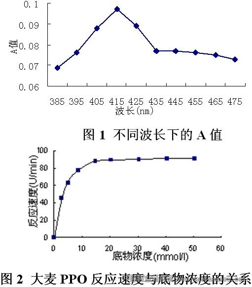 体系反应产物在可见光波385nm—475nm下的吸光值如图1所示。可以看出,体系产物在可见光波长为415nm处,有最大的吸收峰,即在此波长下,体系产物吸光度最大。因此,选取415nm为测定PPO活力的最佳可见光波长。