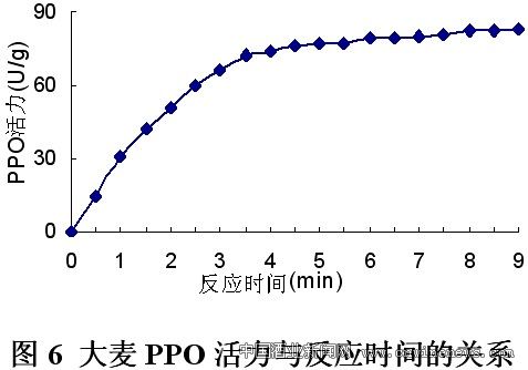 大麦PPO活力与反应时间的关系见图6。可以看出,0min—4min内,反应速率与底物浓度呈线性关系,反应初,酶活力取决于底物浓度的增加。4min后,随着时间的延长,PPO活力几乎趋于一恒值,说明酶已被反应完全。因此,取0min—4min为检测PPO活力最佳反应时间。