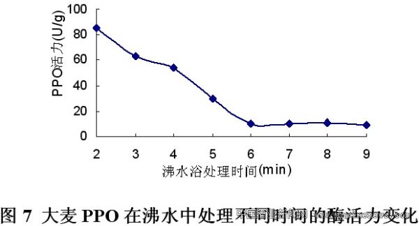 大麦PPO在沸水中处理不同时间的酶活力变化见图7。可以看出,随着酶液在沸水中处理时间的延长,PPO活力逐渐降低,直至6min时,PPO活力降至最低且变化很小,且反应体系中几乎无褐色生成。因此,国产大麦PPO在沸水中处理6min即可有效抑制其活性。这说明组织或匀浆中的酶,可能被结构中的其他胶体物质(蛋白质、碳水化合物等)所保护,可能比钝化形式的酶更耐热。