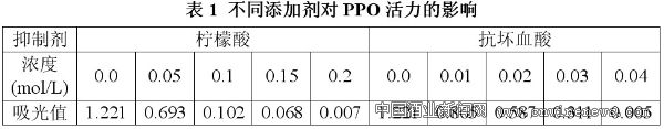 柠檬酸、抗坏血酸对PPO活力的影响见表1。可以看出,随着柠檬酸浓度的增加,吸光值越来越低。也就是说,抑制作用越来越强,当柠檬酸浓度为0.2mol/L时,即可有效抑制PPO活力。这主要是因为柠檬酸的羧基对PPO辅基铜有较强的螯合作用,并同时改变了反应体系的pH,因此降低了PPO的活力。
