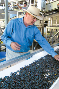 Oakville grower Andy Hoxsey looks over some freshly harvested pinot noir winegrapes as they move along a conveyor belt at Napa Wine Co. |