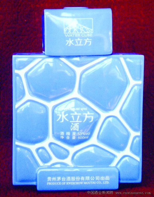 “水立方”这神奇的建筑激发了茅台酒瓶设计师的想象力,他们设计出了类似“水立方”造型的酒瓶,同样吸引了人们的眼球,激发了人们购买的欲望。水立方酒瓶,为蓝色扁方形,整体高20厘米,瓶身高14厘米,宽14厘米,瓶身四面均由大大小小的“气泡”块状物组成,大的直径5.5厘米,小的1.5厘米—2厘米,蓝色块状,白色线条,仿佛是一块块透明的乙烯材料,镶嵌在瓶壁上,十分逼真。在瓶身正面的“气泡”上,烧制有“水立方酒”酒名及酒精度、净含量等,下端烧制有“贵州茅台酒股份有限公司出品”的字样。瓶盖特别大,正面烧制有水立方图案及中英文字“水立方”。